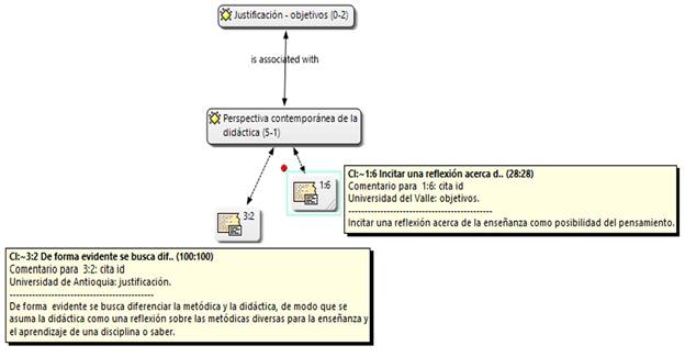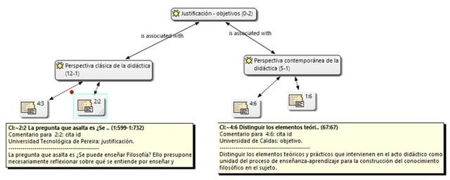 En la Figura 1 se evidencian las correlaciones entre los dos ejes relevantes dentro de los planes de estudio desde la perspectiva de las secciones denominadas justificación y objetivos. De allí se derivan las categorías centrales de estudio: perspectiva clásica en didáctica y perspectiva contemporánea en didáctica. En ambas se encuentran unidades de registro que solo corresponden a las secciones de los programas, ya antes mencionadas.