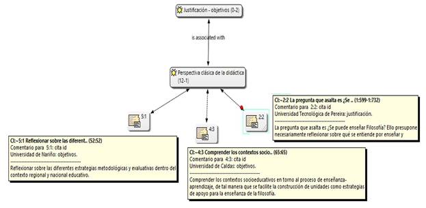 Los elementos asociados a esta red y que corresponden a la perspectiva clásica de la didáctica contienen ocho registros y ellos, a su vez, aparecen dentro de los currículos y programas de cuatro de las universidades: U2, U3, U4 y U5. La U2, por ejemplo, contempla como objetivo: "Dotar al estudiante de elementos conceptuales y herramientas didácticas que le permitan formular metodologías de clase afines a la naturaleza de la Filosofía". De igual forma lo establece la U3 cuando expresa: "Promover la discusión sobre los métodos y prácticas utilizadas en la enseñanza de la filosofía". Para el caso de la U4 se habla de "aplicar estrategias y técnicas de evaluación que favorezcan el aprendizaje significativo de la filosofía". Por último, en la U5 se busca "reflexionar sobre las diferentes estrategias metodológicas y evaluativas dentro del contexto regional y nacional educativo".