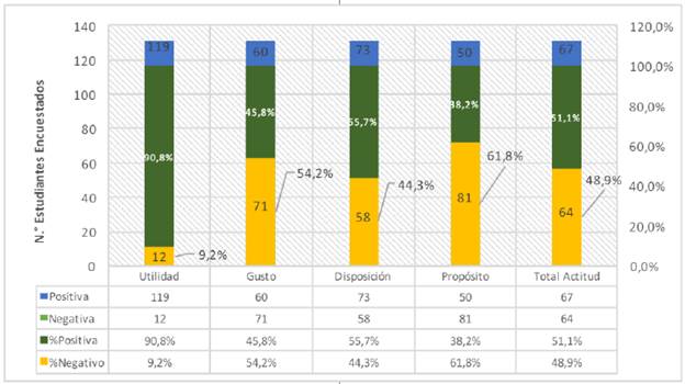 Al medir las actitudes hacia la lectura en inglés se obtuvo que la mayoría de ellos (90,8 %) respondió positivamente a las preguntas relacionadas con la utilidad de la lectura en inglés; es decir, los estudiantes consideran que la lectura en inglés es útil en el proceso de aprendizaje, en la formación personal y en el ejercicio de su profesión. No obstante, al indagar específicamente por el gusto, la mayoría (54,2 %) mostró una actitud negativa, es decir, que para ellos la lectura en inglés no representa una actividad placentera o no les atrae leer en inglés cualquier tipo de material.