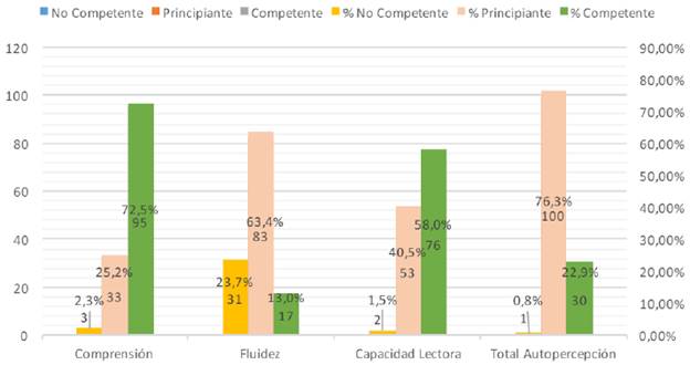 En relación con la autopercepción, si se atiende a la gráfica 4, un 72,5 % de los estudiantes se considera competente a la hora de comprender los textos en inglés. En cuanto a la fluidez, se evidencia que un 63,4 % se percibe como principiante, es decir, que necesitan de varias lecturas para alcanzar la comprensión y la velocidad de lectura es lenta. El 58,0 % se autopercibe capaz de leer textos en inglés de distinta complejidad, aun cuando les lleve tiempo hacerlo.