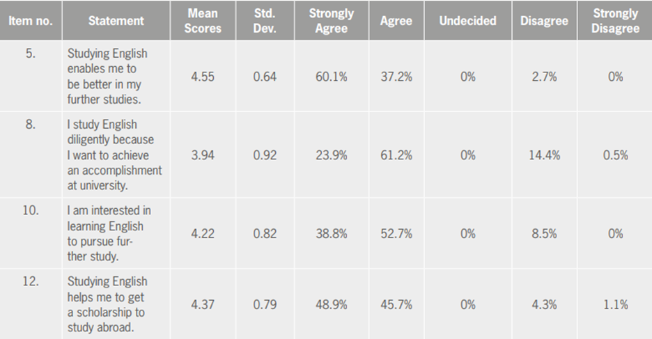 This is the overview of Table 2. Item 5 ‘Studying English enables me to be better in my further studies’ produced the highest mean score at 4.55. A total of 183 participants (87.3%) agreed with the statement. Item 12, “Studying English helps me to get a scholarship to study abroad” produced the second-highest mean score, at 4.37. 178 participants (97%) supported the statement. Item 10, “I am interested in learning English to pursue further study” produced a mean score of 4.22, with170 participants (91.5%) either agreed or strongly agreed with the statement. Last, item 8, “I study English diligently because I want to achieve an accomplishment at university”, obtained a mean score of 3.94, the lowest in this category. Despite this, 160 participants (85.1%) supported the statement, still implying a high level of motivation, generally. These findings, overall, suggested that the participants generally had a high level of instrumental motivation regarding the pragmatic benefits of obtaining academic success.