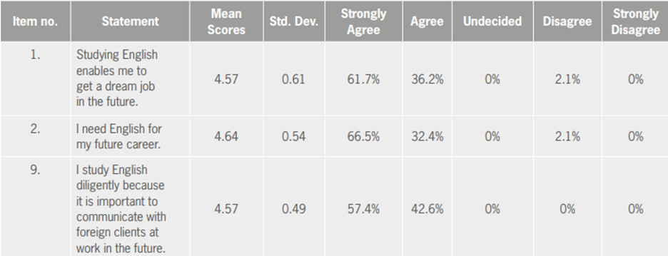 The detailed results on the second category “learning English for future careers” involving items 1, 2, and 9 can be found in Table 3.