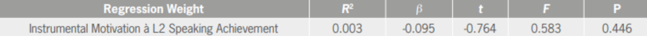 From Table 5, it can be seen that learners’ instrumental motivation barely influenced their L2 speaking achievement, β = -0.10, F (1, 186) = 0.58, p = 0.45. The R2 value is 0.003, indicating that learners’ instrumental motivation only affected 0.3% (less than 1 per cent) of the total variance in L2 speaking achievement. This suggested that, in the present study, instrumental motivation barely affected L2 achievement.