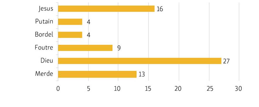 Finalmente, como lo muestra la Figura 13, el tt en francés hace menos uso de expletivos que los otros textos y muestra una gran diferencia numérica entre las entradas de los expletivos más comunes merde, nom de dieu y bon dieu y el resto.