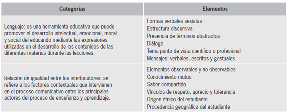 Como premisa fundamental de este trabajo, se concibe el lenguaje como un fenómeno práctico, social y cultural, así quienes hacen uso del lenguaje realizan actos sociales y participan en la interacción social, típicamente en la conversación y en otras formas de diálogo (Van Dijk, 2001). En consecuencia, para analizar si el lenguaje del personal docente actúa como un elemento de exclusión, se parte de la comunicación que se establece a través del diálogo entre estudiantes y docentes para conformar un esquema de análisis que permita identificar e interpretar las formas de intervención verbal que se originan en los procesos de enseñanza y aprendizaje.
