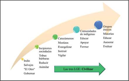 Por último, es necesario resaltar dos aspectos importantes por tener en cuenta para el análisis y la interpretación de las tres LGE de Colombia, relacionados con los actores sociales beneficiarios de las leyes en cuestión y el efecto de las acciones del actor social Estado y sus operadores. En primer lugar, los actores sociales representados inicialmente en las leyes anteriores como "indios salvajes e incivilizados", sufren una transición que los vincula con "nuevas alteridades": "los mestizos", que en adelante se proyectarán en las leyes de la educación colombiana y continuarán la transformación por efecto de las acciones del Estado. La figura 1 muestra la transición de un estado a otro, su continuidad, especialmente por las acciones de la Escuela, es decir, el "Otro" como indio salvaje o bárbaro, por efectos de la gobernanza o reducción a la vida civilizada, va transitando a otros "estadios", siempre superiores: incipientes sociedades, catecúmenos, mestizos, comunidades indígenas, grupos étnicos o minorías, en razón de los efectos de la gobernanza, la reducción, la evangelización, la catequización, la instrucción, la vigilancia, la formación, el apoyo y la educación. Estas transformaciones, igualmente, sucederán a los sobrevivientes y a sus descendientes.