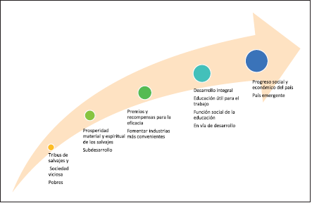 En todos los casos, sea en las tres LGE o en las normas específicas para las alteridades indígenas, se muestra como una constante el ideal desarrollista y productivista bajo los preceptos occidentales. Dicho ideal se convierte en un propósito fundamental que se debe impulsar desde todos los frentes, especialmente desde el educativo, apelando a todas las estrategias y tácticas conductistas, como la asignación de premios y recompensas para buscar la eficacia en la productividad y encontrar la anhelada prosperidad material. En este orden de ideas, se observa que, aunque cambien los significantes, se llega al mismo punto: conducir a todas las sociedades, especialmente a las alteridades indígenas y sus descendientes, a salir del subdesarrollo y avanzar hacia el desarrollo y el progreso como última instancia, tal como se observa en la figura 2.