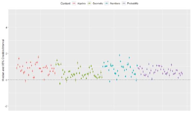 Identificación por subpruebas de los ítems que tienen sesgo para los estudiantes técnicos. Para identificar el contenido matemático que se evalúa y que tiene un mayor nivel de dificultad para los estudiantes de la modalidad técnico profesional se desarrolló una representación gráfica adicional. En esta, se identifican las diferencias en el parámetro de dificultad entre los grupos (científico humanista vs. técnico profesional) por subprueba de matemáticas (álgebra, geometría, números y probabilidad) con su respectivo intervalo de credibilidad. Si la diferencia entre grupos por cada ítem es cercana a 0, el ítem no tiene funcionamiento diferencial (no afectará a ninguno de los grupos) y estará representado cerca de la línea de ajuste en la figura 3. La figura 3 presenta estas diferencias en la dificultad entre grupos científico humanista vs. técnico profesional.