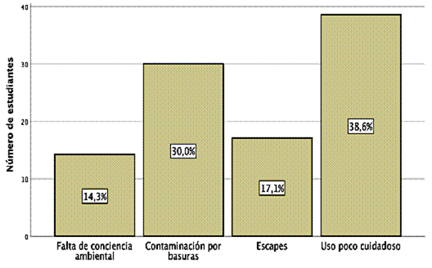 El cuestionario sobre las percepciones de los estudiantes de grado quinto acerca de los problemas ambientales de su entorno escolar muestra que, según el 38,6 %, el mayor problema relacionado con el recurso hídrico en el colegio era el desperdicio del agua, ya que, por ejemplo, algunos estudiantes suelen dejar las llaves del agua abiertas o juegan a mojarse en los baños, como lo muestra la figura 1. El 30 % reconoció algunas formas de contaminación del agua, como la generada por desechos sólidos que algunos ciudadanos botan en espacios naturales como el río Bogotá y los humedales de la localidad de Engativá. Así mismo, el 17,1 % manifestó que los daños de las tuberías dentro de los hogares generan un gran desperdicio de agua; el 14,3 % opinó que los bogotanos carecen de hábitos para el cuidado del agua, la contaminan con vertimientos de aguas negras de sus casas y empresas, dañando así los ecosistemas naturales de reserva de agua para Bogotá (véasefigura ).