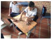 En la fotografía 2 se ve a una artesana y madre de familia de una de las niñas de la clase, enseñando a entrencillar y otros procesos artesanales. El propósito de la vinculación en la fase educativa de los artesanos que participaron en la fase etnográfica no es para que los alumnos aprendan a ser artesanos, sino para que respondan matemáticamente a las acciones o preguntas que proponen los artesanos y los profesores (titular y en formación) más la valoración por parte de ellos de las prácticas artesanales. La enseñanza paralela y comparativa es la respuesta incluyente a la institucionalización de un solo saber en la clase de matemáticas.