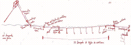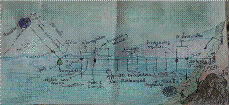 Posteriormente nos dimos a la tarea de hacer una tercera versión, incluyendo datos que se habían encontrado en otras entrevistas y en aportes de otros pescadores. A partir de ahí se hizo una primera versión del aparejo de pesca que se muestra a continuación.