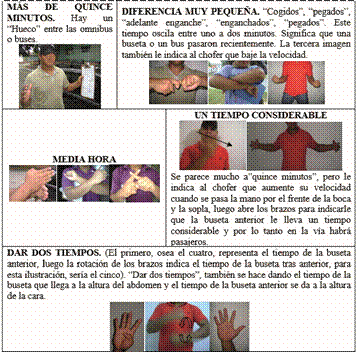 Hemos tenido la oportunidad de realizar algunas investigaciones donde se demostró que los gestos eran esenciales para la comunicación; sin ellos, la práctica no tendría significado. Por ejemplo, sin los gestos es imposible que se comuniquen matemáticamente el controlador de tiempos y los conductores de buses de transporte urbano de algunas ciudades capitales de Colombia (véase por ejemplo Aroca, 2015b). De hecho, este sistema de comunicación se denominó sistema numérico-gestual para la comunicación, debido a que los involucrados en la práctica así lo denominaban. Los entrevistados hacían alusión explícita a los gestos, a los números y a la comunicación. La figura 6 muestra una parte de esos gestos especializados en matemáticas.