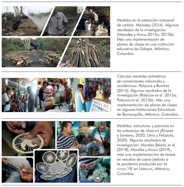 La reflexión del aporte al (los) entrevistado(s) con este tipo de investigaciones. En alguna ocasión un investigador nos preguntó cómo se benefician los artesanos con este tipo de investigaciones. Una respuesta a esta pregunta depende en gran medida de la profesión que ejerce el investigador, en nuestro caso, somos educadores matemáticos. Puesto que se escoge una Institución educativa contextualizada a la práctica del entrevistado, los beneficiarios son tanto el entrevistado como su comunidad, que aprende en las aulas de clases los saberes comunitarios matemáticos que su actividad ha desarrollado. La valoración de las prácticas artesanales, de los artesanos mismos, por parte de la comunidad al incluirlos en los planes de clases escolares, más la divulgación de resultados investigativos como libros, capítulos de libros, artículos, conferencias, talleres, videos, etc., es decir, la apropiación social del conocimiento también es un beneficio para los artesanos en su valoración comunitaria. Hay algo que parece un acto sencillo, simple, pero que merece ser descrito: cuando divulgamos en nuestro canal de YouTube, Matemáticas del Pueblo. People’s Math, los videos de las entrevistas a los artesanos podemos ver su rostro de felicidad, de reconocimiento, e incluso hemos visto cómo el enlace les ha servido de carta de presentación ante otras personas. Para finalizar una anécdota de gran orgullo sobre el impacto y beneficios de nuestras investigaciones: en el 2013 hicimos una investigación sobre curtidores artesanales de cuero de vaca y chivo, de la cual se derivó un libro. En el 2021, una familia con poder político y económico deseaba retirar de su lugar ancestral de trabajo a los curtidores artesanales que estaban al lado de un río porque consideraban que lo contaminaban. Uno de los argumentos de los curtidores fue mostrarle el libro a dicha familia, y desde entonces el conflicto terminó. La historia con más detalles se puede ver en un video de YouTube, Aroca (2021b), y el libro se puede consultar en Aroca (2013b).