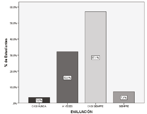 Para la dimensión relacionada con la Evaluación, las estudiantes tienen la capacidad de emitir juicios sobre las acciones y estrategias que emplearon en la actividad de RP y evalúan la efectividad y eficacia de sus procedimientos, que al ser positivos empleará en futuras resoluciones de otros problemas matemáticos; asimismo valida dichos procesos con el docente o algunos compañeros. Es así como en la figura 5 se advierte que el 64,2 % de las estudiantes seleccionan las escalas Siempre o Casi siempre, mientras que el 32,1 % asegura que exponen este tipo de juicios en algunas ocasiones, y el 3,6 % restante casi nunca evalúa sus procesos; con esto se evidencia que no en todas las ocasiones hay lugar a la reflexión sobre los resultados obtenidos. Estos resultados continúan reflejando las dificultades en el proceso de planificación; en la dimensión de evaluación, revelan que no verifican si la solución a la que llegaron valida el enunciado del problema. Esto, en gran medida, se presenta cuando como profesores no reflexionamos sobre el proceso de solución, y se da prioridad a revisar si la respuesta es correcta.