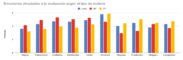 La frecuencia media más elevada se encontró en la sensación de ansiedad en el caso de Labo (2,91) y de TP (2,95), mientras que en materias BP se presentó en la confianza (2,67). A su vez, la frecuencia media más baja se encuentra en la angustia en el caso de BP (1,48), y la alegría en Labo (1,81) y en TP (1,61).