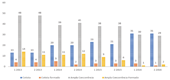 Figura 2: Gráfico de ingressantes cotistas e ampla concorrências por semestre