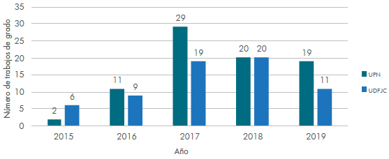 Al discriminar la información de la Tabla 4 por año, se puede evidenciar que, en el año 2017, la UPN elaboró un mayor número de trabajos de grado, 29, en donde relaciona la educación ambiental con la química ambiental, en comparación con la UDFJC, en donde se elaboraron 19. Esta tuvo, durante dos años, el mismo número de trabajos de grado aproximadamente. A pesar de que, desde el 2015, la tendencia para las dos universidades era a aumentar, después del 2017, hasta el 2019, la tendencia fue disminuir el abordaje de estos contenidos, como se observa en la figura 2.