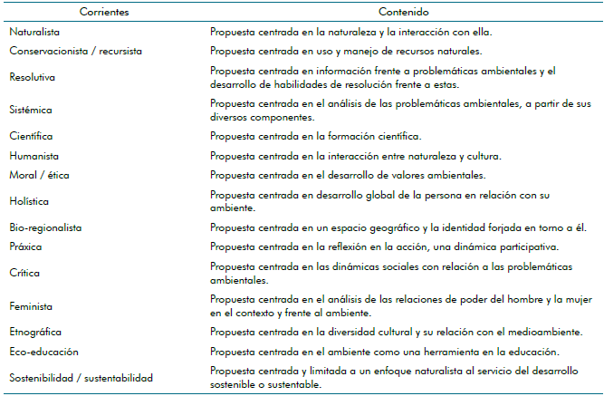 Tabla 1: Corrientes que enmarcan el contenido conceptual de educación ambiental