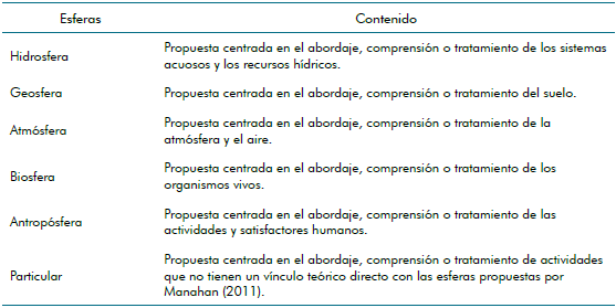 Para los propósitos de la investigación, se concibe el contenido de la química ambiental como “el conocimiento científico mediante el cual esta se orienta y se ejerce partiendo de la educación dirigida al individuo, tomando como referencia las esferas de la química ambiental propuestas por Manahan” (2011) . Estas esferas permiten establecer un análisis desde la química por medio de varios enfoques, su injerencia y su contexto debido a las relaciones planteadas. Según su contenido conceptual se proponen las diferentes esferas en la siguiente tabla: