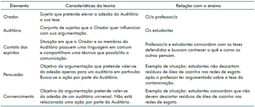 Tabela 1: Elementos da Teoria da Argumentação e a relação com o ensino