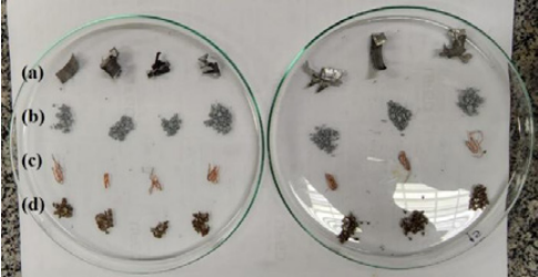 Figura 3: Na primeira linha de cima para baixo: (a) são as raspas de magnésio, na segunda linha o (b) zinco metálico, na terceira linha (c) o cobre e na última linha (d) o ferro metálico.