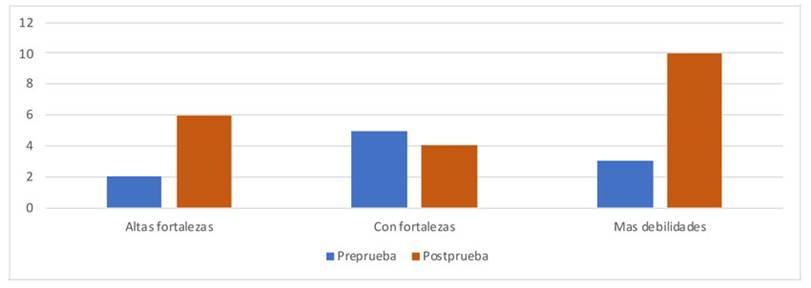 Figura 12: Frecuencias de las categorías acerca de la fortaleza o la debilidad de la autoimagen (antes y después de tomar el curso)