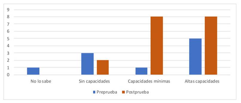 De acuerdo con los resultados presentados en la figura 14, después del curso, el número de alusiones a tener altas o mínimas capacidades para tomar decisiones, así como el de las referidas a no tener dichas capacidades o no saber si las tienen, disminuye o desaparece.