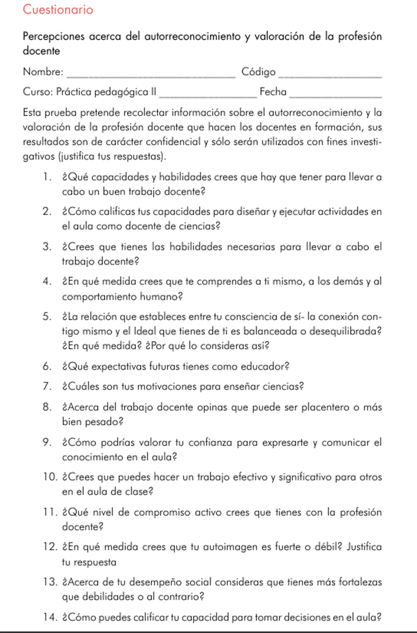 Este artículo presenta los resultados de una investigación acerca del impacto sobre el autorreconocimiento y la valoración de la profesión docente, del curso transdisciplinario de práctica II, que integra la ciencia, el cuerpo, la tecnología y el arte. En ella participaron, bajo consentimiento informado, 13 estudiantes de segundo semestre de Licenciatura en Ciencias Naturales. Luego del curso, los estudiantes mejoraron en la mayoría de los aspectos referidos al autorreconocimiento y a la valoración de la profesión docente; desarrollaron nuevas expectativas para el trabajo docente, como el desarrollo personal y el impulso a la investigación, y aumentaron su consciencia sobre sus fortalezas y debilidades en aspectos como autoimagen, desempeño social y el placer o la dificultad del trabajo docente.