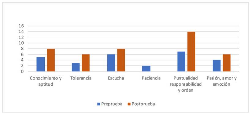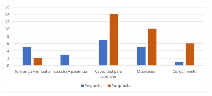 De acuerdo con lo observado en la figura 3, antes y después del curso, se registran pocas alusiones de los estudiantes a la necesidad de poseer capacidades de escucha, paciencia, tolerancia a las diferencias y empatía. Esto podría deberse a que el curso hace que los estudiantes sean conscientes de sus dificultades para desarrollar estas habilidades afectivas, y también porque, en general, los docentes tienen limitaciones en la escucha, la comprensión, el apoyo y la empatía (Espinoza, 2020).