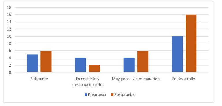 Conforme se observa en la figura 4, tanto antes como después del curso, se registra un pequeño número de alusiones sobre la falta de comprensión de uno mismo y de los demás, y un número aún más reducido que afirma que la comprensión de uno mismo y de los demás se encuentra en conflicto. Esto podría deberse a que, en su formación, se ha dado más importancia a la competencia que a la colaboración (Smith, 2019), y el énfasis ha estado más en el aprendizaje de conceptos y teorías que en el desarrollo humano y la comprensión del otro y de uno mismo (Arredondo et al., 2014).