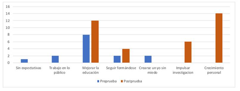 Los resultados mostrados en la figura 6 indican que antes del curso solo hay alusiones a no tener expectativas futuras como docente, y que estas se limitan a aspirar a lograr un cargo público. Tanto antes como después del curso, se observan alusiones a mejorar la educación y a seguir formándose profesionalmente —estas últimas son más frecuentes después del curso—. Este fenómeno podría atribuirse al desconocimiento que tienen los estudiantes sobre sus posibilidades laborales, lo cual contrasta con su conciencia sobre la baja calidad de los procesos educativos en las instituciones públicas y la necesidad de mejorarlos —conciencia que se fortalece después del curso—.