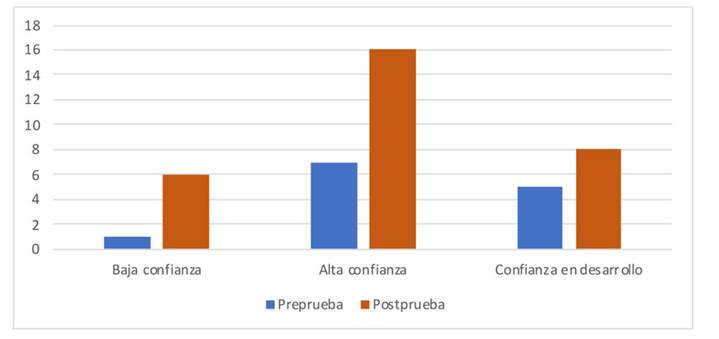 Figura 9: Frecuencia de las categorías acerca de la autovaloración de la confianza para expresar y comunicar el conocimiento (antes y después de tomar el curso)