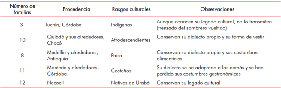 De acuerdo con los resultados de la en cuesta, se identificaron al menos cinco grupos culturales definidos por la afinidad de su lugar de origen, características físicas, costumbres y tradiciones que han sido preservadas por las familias que componen la comunidad. Esta pluriculturalidad se atribuye al desplazamiento de los grupos humanos en búsqueda de mejores oportunidades laborales, ya que la zona es rica en el cultivo de plátano, coco, cacao y aguacate. Estos productos alimenticios se venden semanalmente en grandes cantidades, lo que genera ganancias suficientes para sus tentar a los miembros de la familia.