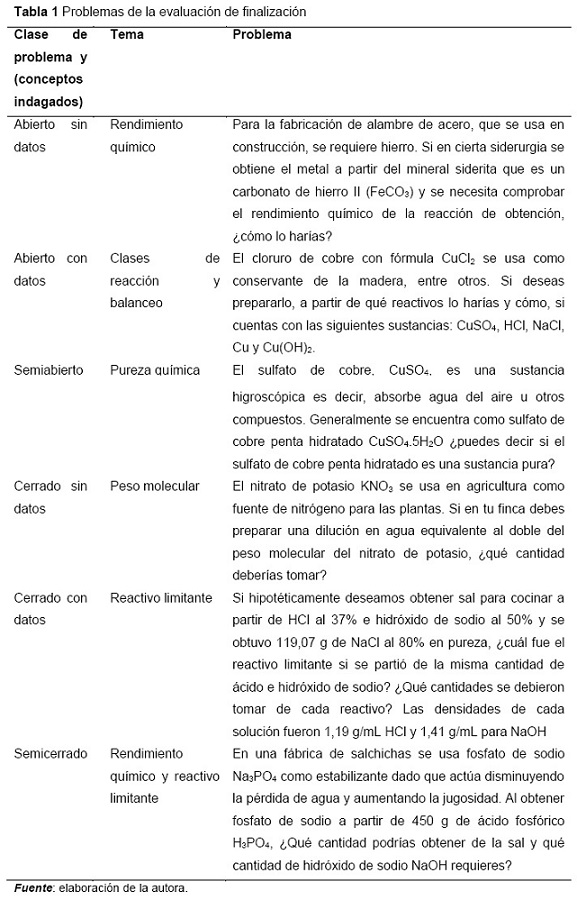 Una vez finalizada la aplicación de las estrategias didácticas se aplicó individualmente una evaluación de finalización donde las estudiantes podían consultar sus apuntes o anotaciones, puesto que no era una prueba de memoria sino que en ella la estudiante demostraba cómo manejaba la información disponible. La prueba consistió en seis problemas, uno de cada clase propuesta en este estudio.