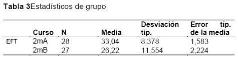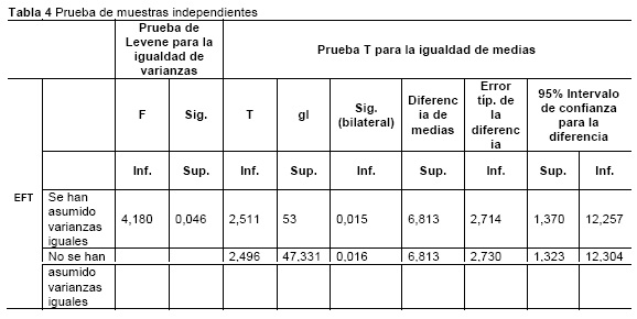 En la tabla 3 se observa que el grupo EPC presenta una media más alta que el grupo ABP, y esa diferencia es significativa como se observa en la prueba T para muestras independientes (Tabla 4).