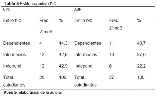 Como se indicó, la clasificación de cada grupo de estilo se estableció mediante terciles del puntaje del EFT. En la tabla 5 se encuentran los resultados obtenidos en la prueba de figuras enmascaradas. Se observa que el grupo de ABP presentó mayor porcentaje de estudiantes con tendencia a la dependencia de campo en comparación con el grupo EPC, que presentó por el contrario un mayor porcentaje de estudiantes independientes de campo.