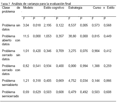 Se realizó un análisis factorial de varianza para cada clase de problema, en el que la variable independiente estuvo constituida por las estrategias didácticas y la variable dependiente fue el logro de aprendizaje en la resolución de problemas y el estilo cognitivo DIC como covariable. Los resultados obtenidos se muestran en la tabla 7.