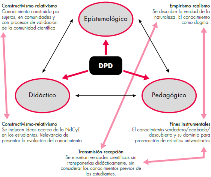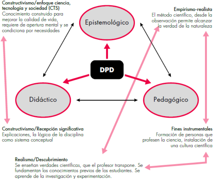 En este esquema, las estrategias, las orientaciones curriculares y las actividades y prácticas didácticas dependen de la asignatura que se imparte. Asimismo es necesario un profundo conocimiento de la disciplina que enseñan, referido por una parte tanto a lo sustantivo y lo sintáctico (es decir, al conocimiento teórico, los marcos teóricos y la estructura interna), y por otra a la fundamentación y evolución de los paradigmas, la historia-filosofía y naturaleza de las ciencias (Adúriz, 2005; Cuéllar, Quintanilla y Marzábal, 2010; Garritz y Velasco, 2004; Quintanilla, 2006).