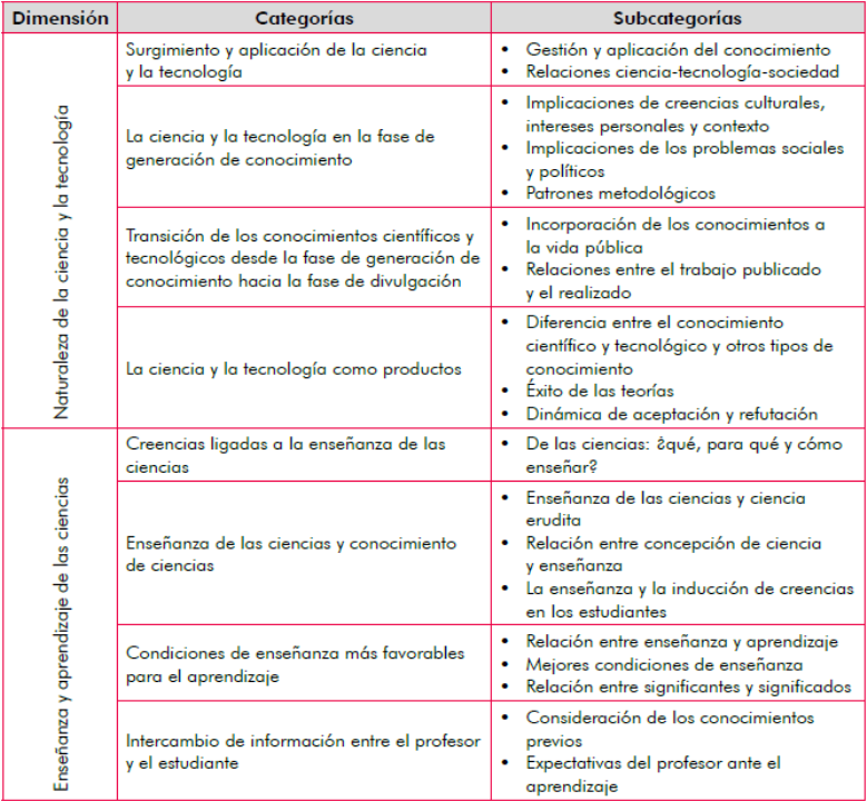 En cuanto a la NdCyT, resulta interesante que en la dimensión, la profesora reconoce las relaciones de complementariedad y mutua interdependencia que existen entre los conocimientos científico y tecnológico (Niiniluoto, 1997), algo que generalmente se entiende como subordinado uno a otro, en un contexto de mera aplicación de conocimientos científicos. Esto, aunado a que la ciencia y la tecnología surgen en contextos de trabajo en equipos permeados por los apoyos económicos en la investigación donde no hay una única metodología, dan cuenta de una visión informada en la que los conocimientos CyT son construcciones humanas, que toman un fuerte matiz constructivista- relativista a nivel epistemológico.