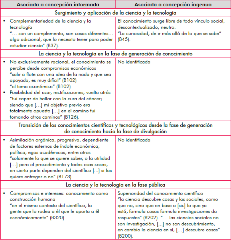 El análisis de la información tuvo como base las variaciones entre una concepción informada y una concepción ingenua por cada categoría, con base en la literatura revisada