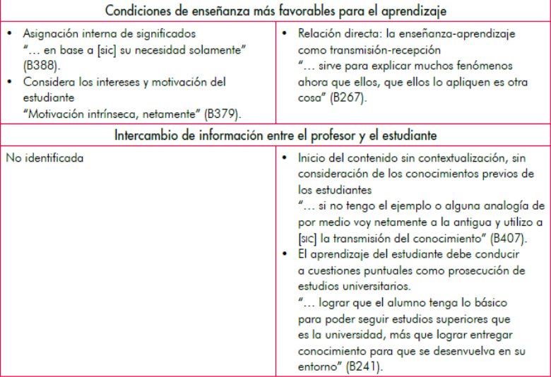 Los profesores refieren cuestiones como: una relación enseñanza-aprendizaje directa, entendida como transmisión-recepción en la que el estudiante es un consumidor de significados construidos (o no) por el profesor, pero a la vez apuestan por la asignación interna de significados donde los estudiantes participan de su construcción. Lo anterior permite preguntarse: ¿aprendizaje como recepción o aprendizaje como construcción? Ante estas dicotomías se mueve el esquema conceptual.