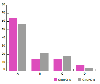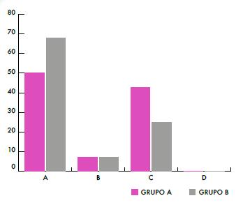 Asimismo, con el fin de determinar la homogeneidad e independencia entre ambos grupos con relación al conocimiento inicial (ideas previas) se ha realizado la prueba chi-cuadrado. Para ello, se comparan las frecuencias observadas en cada una de las opciones de la variable categórica, en nuestro caso respuesta múltiple (a, b, c, d) y grupos (A, B).