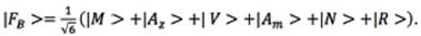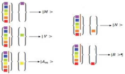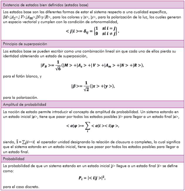 El análisis del efecto y el comportamiento del fotón blanco permite hacer una formalización en torno a lo observado, es decir, a partir del esquema de la figura 2 se puede construir la siguiente representación: fotón morado |M>; fotón azul |A z>; fotón verde |V>; fotón amarillo |A m >; fotón naranja |N>; fotón rojo |R>. A partir de esta representación, el principio de superposición surge naturalmente como la manera de formalizar la relación entre los diferentes fotones, es decir, el estado del fotón blanco |F B > puede ser escrito como una combinación lineal del conjunto de fotones |M>; |A z>; |V>; |A m >; |N>; |R>,