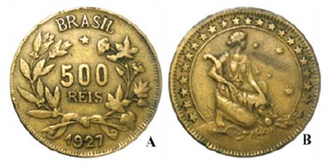 Figura 3: Moeda de 500 réis - A) Anverso: ramos de café e algodão. B) Reverso: a figura da abundância, com joelho apoiado em terra, tendo na destra uma cornucópia; no campo ao lado, a constelação do Cruzeiro do Sul. Em orla 21 estrelas.