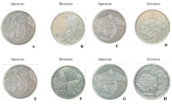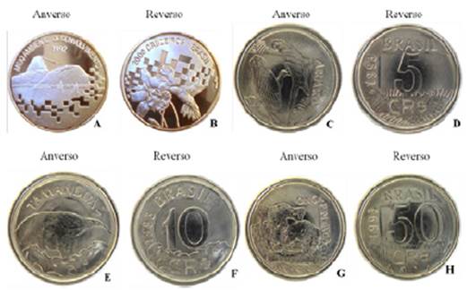 Figura 10: A e B: Moeda de 5 reais (não circulada). A) Anverso: atividade de ciclismo pelo Rio de Janeiro no Parque da Tijuca. B) Reverso: toninhas. C e D: Moeda de 5 reais (não circula¬da). C) Anverso: atividade de remo pelo Rio de Janeiro na Lagoa Rodrigo de Freitas com o Corcovado ao fundo. D) Reverso: conjunto de bromélias. E e F: Moeda de 5 reais (não circu¬lada). E) Anverso: atividade de ciclismo pelo Rio de Janeiro no Parque da Tijuca. F) Reverso: tucano-de-bico-preto. G e H: Moeda de 5 reais (não circulada). G) Anverso: atividade de remo pelo Rio de Janeiro na Lagoa Rodrigo de Freitas com o Corcovado ao fundo. H) Rever-so: botânica: exemplar de uma helicônia - planta ornamental originária da América do Sul.