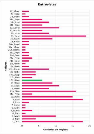 En la gráfica, el eje Y corresponde a los códigos de los atributos deseables que más datos registraron en la autobiografía. El eje X corresponde al número de unidades de registro (ÜR) los cuales son fragmentos, producto del análisis de contenido, que dan cuenta de los atributos de identidad profesional para el ámbito personal. Para este ámbito se establecieron seis atributos deseables, codificados de 1 a 6. Así mismo para las entrevistas (Véase figura 3) y los diarios de profesor (Véase figura 4).Figura 3. Atributos deseables de la Identidad Profesional Docente fortalecidos en la entrevista personal.
