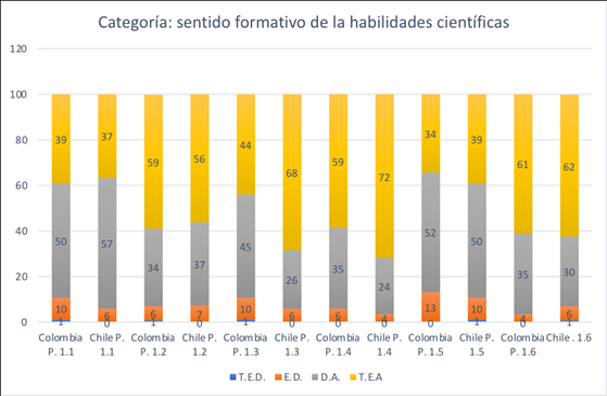 Figura 1: Distribución en porcentaje por cada ítem de las respuestas de los docentes de Colombia y Chile en la categoría sentido formativo de las habilidades
