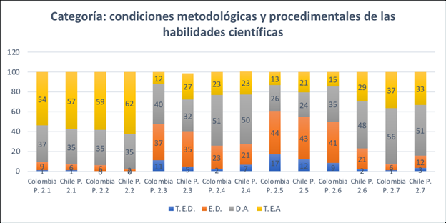 En la categoría condiciones metodológicas y procedimentales de las habilidades científicas se identifica una semejanza en la percepción en la escala totalmente de acuerdo en ambos países: 54 % Colombia y 57 % Chile en el ítem 2.1 (las habilidades científicas son comunes a todas las disciplinas que conforman las Ciencias Naturales) y también en el ítem 2.2 (es necesario diseñar tareas y actividades específicas para los estudiantes en función de las habilidades científicas) con un 59 % Colombia y 62 % Chile. Al respecto, analizando el ítem 2.1, el MEN de Colombia ha sido persistente en su política pública de incorporar en el currículo nacional un enfoque interdisciplinario durante la formulación y desarrollo de los proyectos pedagógicos.