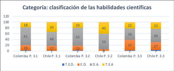En la categoría clasificación de las habilidades científicas en el ítem 3.1 (están claramente descritas las habilidades científicas que se deben desarrollar en cada nivel escolar (preescolar, básica y media) ambos países comparten estar en acuerdo, mientras Colombia tiene un 61 % de acuerdo, Chile tuvo un 48 % con la misma percepción; aspecto que podría relacionarse con la promulgación de bases y estándares curriculares oficiales en ambos países, ya que en la última década señalan como eje del currículo en la básica-media el enfoque basado en competencias, donde los objetivos de aprendizaje se relacionan en forma más explícita con las habilidades, los conocimientos y las actitudes.