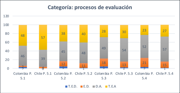 Figura 5: Distribución en porcentaje por cada ítem de las respuestas de los docenes de Colombia y Chile en la categoría proceso de evaluación